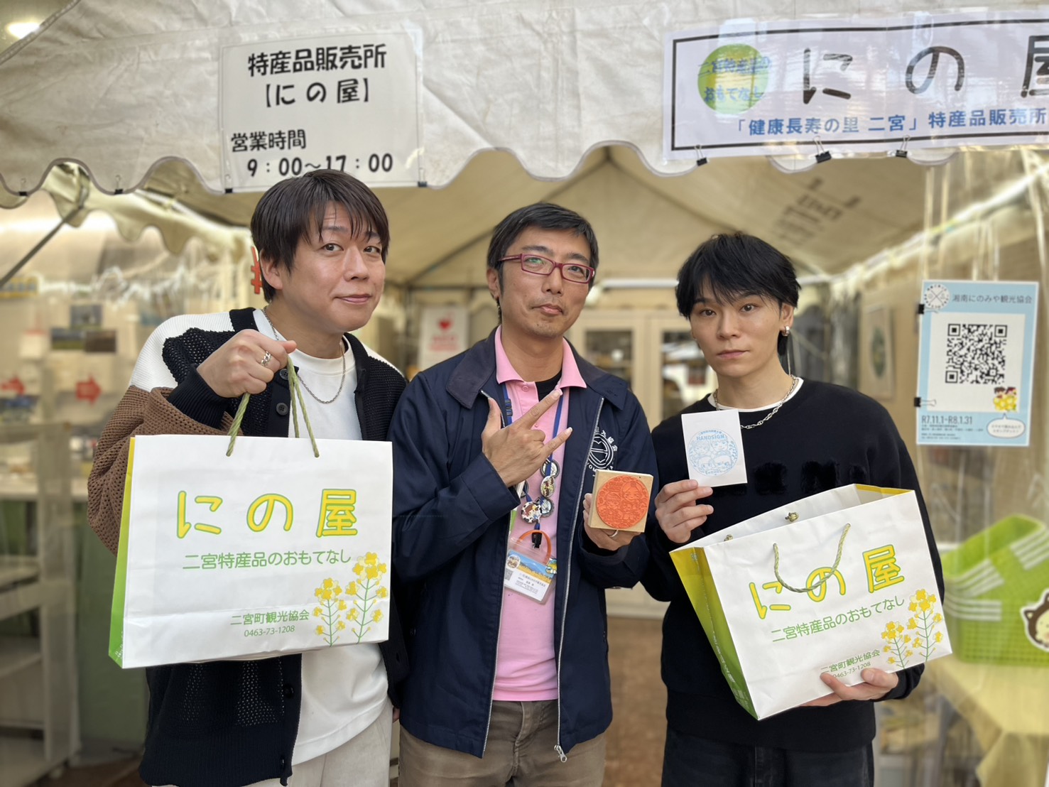 二宮町の特産品を販売している「にの屋」では、二宮町観光協会の事務局長で、HANDSIGNとも地元のつながり(後輩?)がある髙澤さんに案内してもらいました!今の時期は、銀杏がとても好評とのこと!実際にHANDSIGNの2人も試食していて、エメラルドグリーンが美しく、とても美味しかったそうです!TATSUさんはなんと箱買いまで!?皆さんもぜひ味わってみてください!